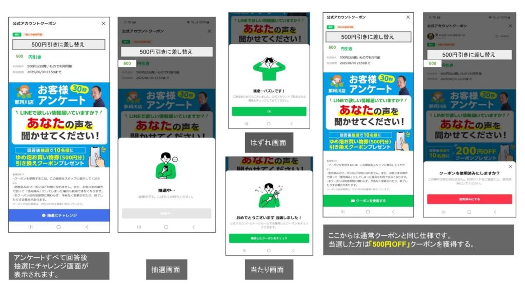 などを項目として設計し、LINE内で回答から特典獲得まで完結する仕組みにすることで、ユーザーの負担を感じにくい設計にしています。